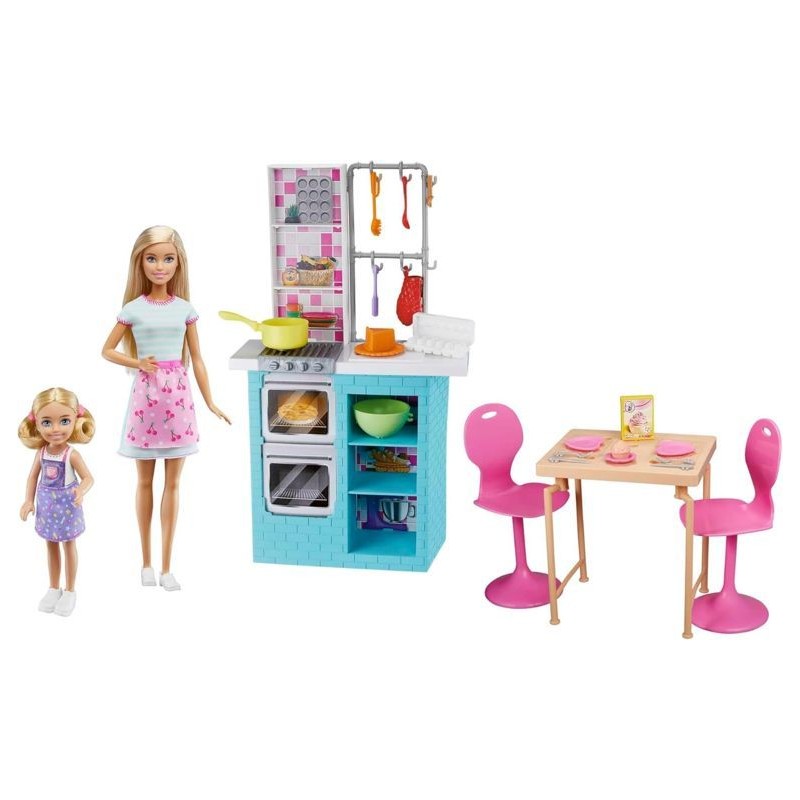 Questo playset Barbie è perfetto per divertirsi in cucina con Barbie e la sorellina Chelsea utilizzando tutto ciò di cui hanno bisogno per preparare i loro dolcetti