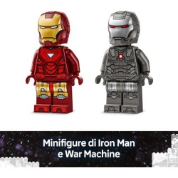 Minifigure LEGO Marvel include una minifigure LEGO Iron Man con blaster blu su mani e piedi e armi raggio laser e una minifigure di War Machine con blaster rossi su mani e piedi e uno shooter spara bottoncini