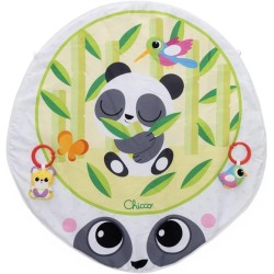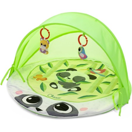 COMFORT E PROTEZIONE La palestrina è dotata di un area di gioco imbottita con una tenera illustrazione a tema panda e di un tettuccio pieghevole e removibile con rete traspirante per proteggere il bambino dal sole e dal vento