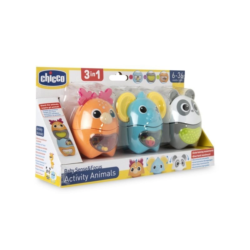 Tre animaletti colorati con cui il bambino può divertirsi in 3 modi diversi impilandoli costruendo torri a forma di totem e stimolando i sensi