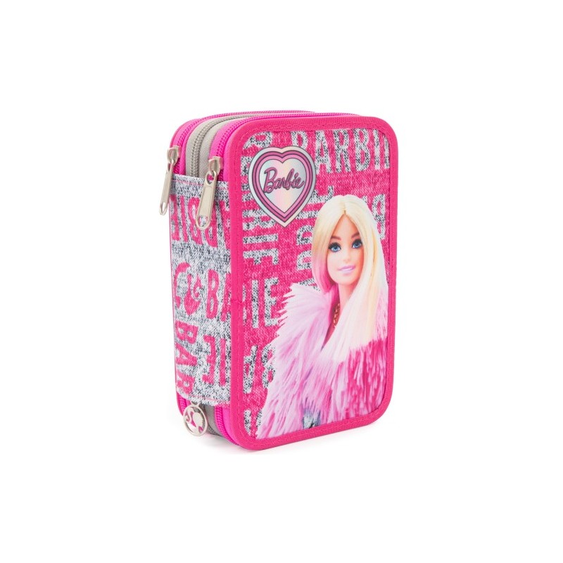 Astuccio 3 zip con corredo Barbie Dimensione 13 x 19 x 6 5 cm Contenuto 18 pz matite colorate 18 pz pennarelli 1 pz penna 1 pz penna a sfera rossa 1 pz matita 1 pz gomma 1 pz righello 1 pz temperino 1 pz paio di forbici