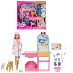 Con la Barbie Veterinaria i bambini possono prendersi cura dei loro amici a quattro zampe Il set include una clinica attrezzata con tavolo da visita accessori e strumenti per curare cuccioli di cane e gatto Barbie indossa il camice da veterinaria e un abito decorato a tema pronta a salvare ogni animaletto