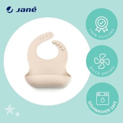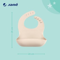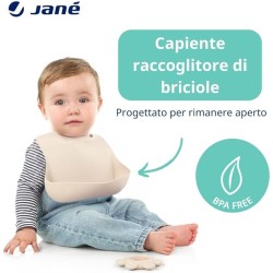 FUNZIONALE Il bavaglino in silicone Jané è dotato di un grande raccoglibriciole E' progettato per rimanere aperto e raccogliere tutto il cibo che può cadere sul piccolo evitando macchie e sporcizia