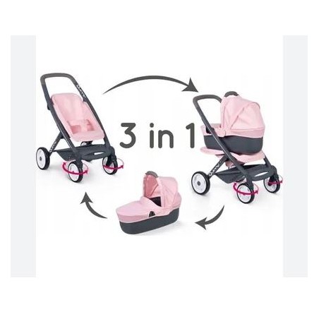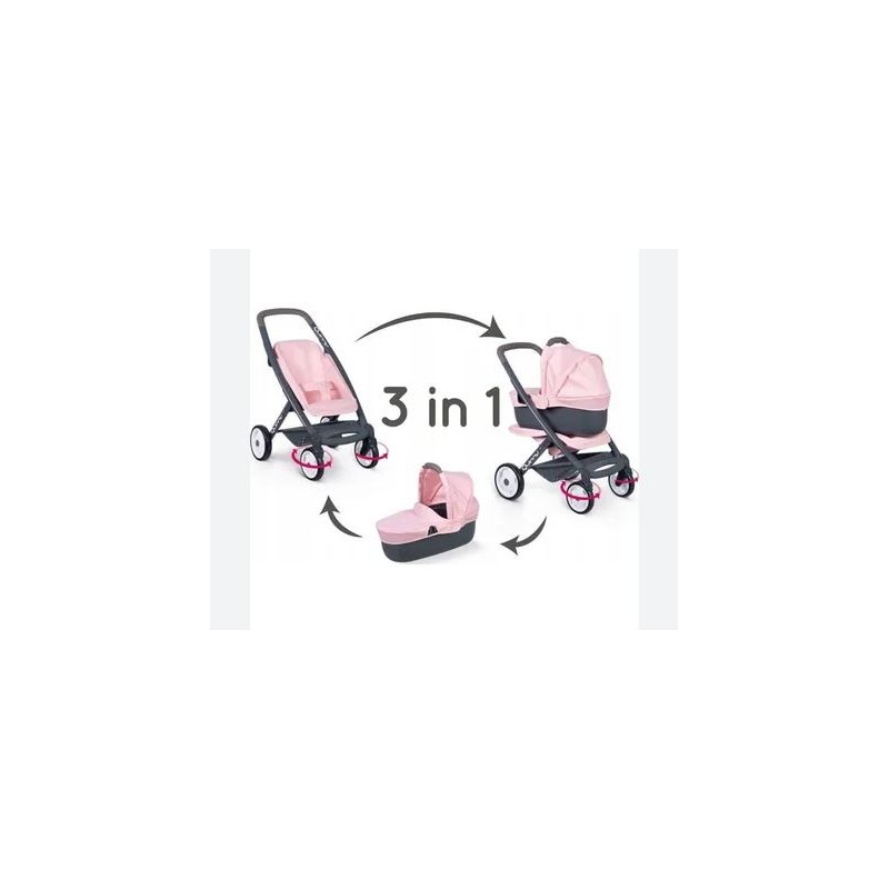 Tutto è possibile con questa carrozzina multifunzionale per bambole Smoby 3 in 1 con design alla moda Maxi Cosi grazie alla seduta intercambiabile questa moderna carrozzina per bambole può essere trasformata in un attimo in una pratica carrozzina sportiva per bambole Quando la bambola è stanca la tua piccola può dormire comodamente nella carrozzina la parte superiore può essere rimossa in pochi semplici passaggi permettendo ai genitori di portare la loro piccola ovunque vadano nella pratica navicella Per emozionanti viaggi di scoperta la carrozzina per bambole può essere trasformata in un passeggino comodo da usare le coperture della carrozzina per bambole sono realizzate in robusto tessuto plastico e sono facili da pulire con un panno umido
