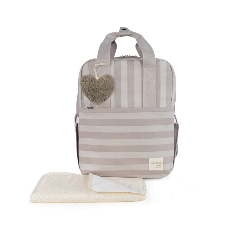 Zaino e borsa fasciatoio due in uno ideale per trasportare le vostre cose e quelle del vostro bambino con stile in tutte le vostre passeggiate Lo zaino Sintra a righe beige è un modello molto leggero resistente e multifunzionale con una grande capacità di trasportare tutto il necessario per le passeggiate del vostro bambino Include un ciondolo a forma di cuore su cui è possibile ricamare il nome del bambino per personalizzare la borsa Il suo design offre molteplici tasche esterne e interne per tenere tutto in ordine e a portata di mano Dispone di tasche per riporre i biberon e tenerli al sicuro tasche elastiche per le posate salviette un porta borraccia e molto altro Include un fasciatoio abbinato alla borsa premaman e una tasca laminata per riporre i vestiti bagnati e isolare l umidità dal resto della borsa Ha anche una tasca esterna per le salviette umidificate La borsa comprende 2 manici corti regolabili che la rendono facile da agganciare a qualsiasi modello di passeggino cinghie per le mani e cinghie imbottite da appendere alle spalle verso la schiena senza generare disagi a causa del peso Alta qualità e stile Realizzato in materiale resistente e facile da pulire Misure 28X37X12 cm