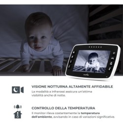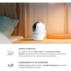 Visione Notturna a Infrarossi Monitoraggio della Temperatura Tieni d occhio il tuo bambino giorno e notte con la visione notturna a infrarossi cristallina e resta informato sui cambiamenti di temperatura ambiente con allarmi sonori per assicurare comfort e sicurezza al tuo bambino