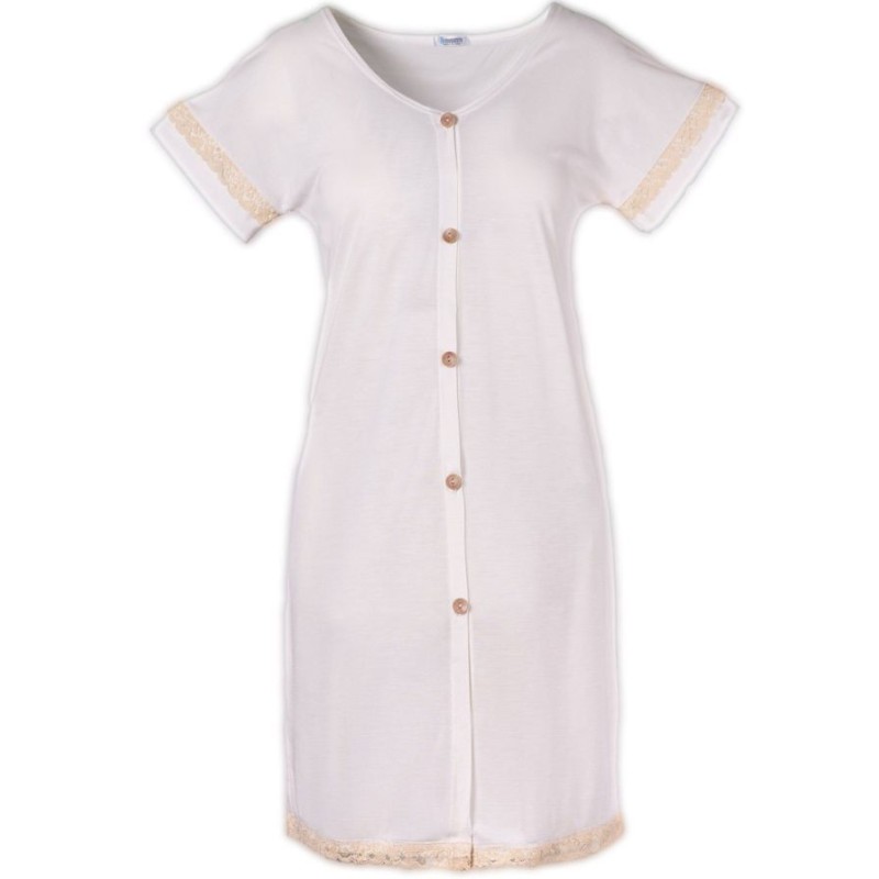 Realizzata morbido tessuto di bambù elasticizzato con maniche corte e collo a serafino Con apertura al centro fino sottoseno con bottoni automatici in contrasto Stampe testo e bordature superiori in constrasto di colore bianco Comoda e pratica adatta sia in gravidanza e durante l allattamento