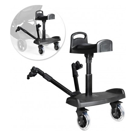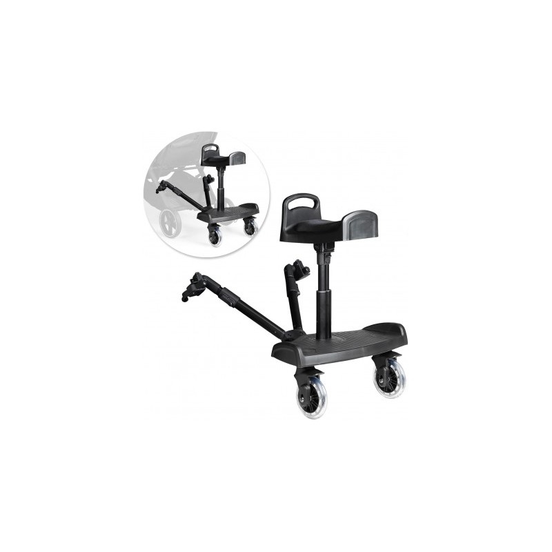 Comfort in ogni passeggiata il bambino può sedersi o stare in piedi sulla pedana per passeggino Innovaciones MS rendendo il suo viaggio più piacevole La pedana si collega al passeggino con uno speciale adattatore incorporato nel prodotto in grado di adattarsi a tutti i passeggini Questo tipo di monopattino permette al fratello maggiore di sedersi comodamente a cavalcioni sul monopattino stesso o di andare in piedi