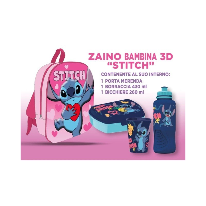 STITCH ROSA ZAINETTO ASILO 3D CON BORRACCIA PORTAMERENDA E BICCHIERE