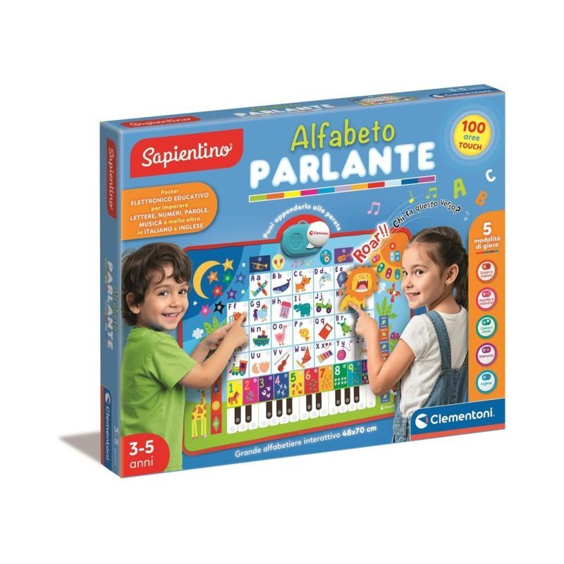 SAPIENTINO ALFABETO PARLANTE poster elettronico educativo bilingue italiano e inglese per imparare lettere numeri parole e musica con attività che stimolano linguaggio logica memoria e ascolto in modo divertente