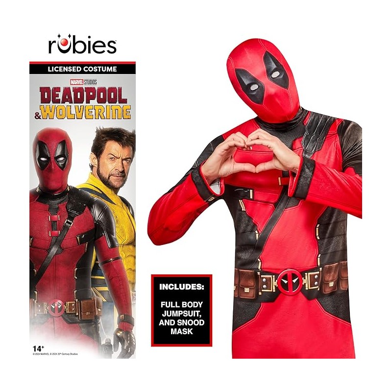 INCLUDE Questo costume per adulti di Deadpool contiene tute stampate digitalmente con dettagli simili a quelli del personaggio del film chiusura posteriore in velcro per indossarlo facilmente Include anche una maschera in tessuto traspirante abbinata con una maschera facciale in rete