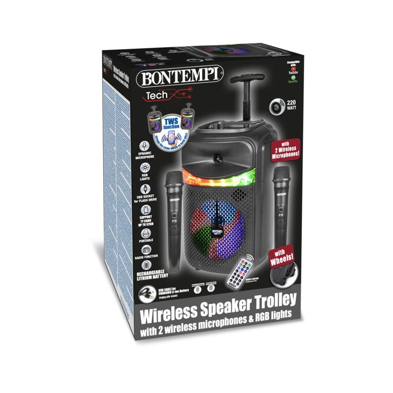 Cassa acustica wireless trolley con 2 microfoni senza filo e luci RGB Telecomando Display per visualizzare le funzioni correnti Funzione TWS consente di connettere due speaker dello stesso modello al medesimo smartphone o altra sorgente wireless e godere di una qualità del suono stereo Puoi ascoltare musica audio da USB Flash Drive non fornita da micro SD card non fornita da smartphone tablet PC Laptop ecc cavetto di connessione non incluso utilizzando la connessione wireless Bontempi491070 Funzione radio Regolazione dell effetto eco Regolazione volume del microfono Equalizzatore Registrazione della voce Funzione priorità microfono Tasto attivazione effetti luminosi Presa USB Tipo C per ricaricare la batteria al litio cavetto di carica fornito Dim 260x820x240 mm