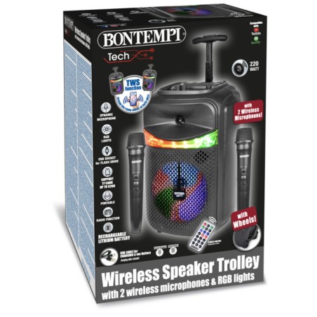 Cassa acustica wireless trolley con 2 microfoni senza filo e luci RGB Telecomando Display per visualizzare le funzioni correnti Funzione TWS consente di connettere due speaker dello stesso modello al medesimo smartphone o altra sorgente wireless e godere di una qualità del suono stereo Puoi ascoltare musica audio da USB Flash Drive non fornita da micro SD card non fornita da smartphone tablet PC Laptop ecc cavetto di connessione non incluso utilizzando la connessione wireless Bontempi491070 Funzione radio Regolazione dell effetto eco Regolazione volume del microfono Equalizzatore Registrazione della voce Funzione priorità microfono Tasto attivazione effetti luminosi Presa USB Tipo C per ricaricare la batteria al litio cavetto di carica fornito Dim 260x820x240 mm
