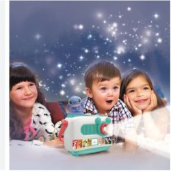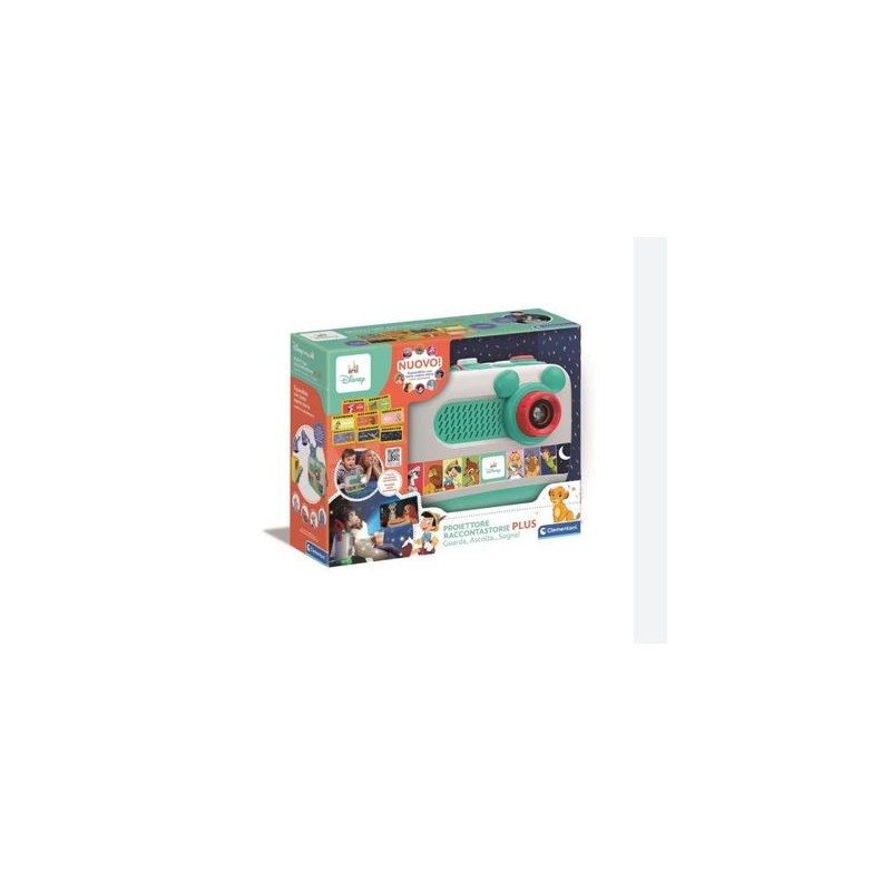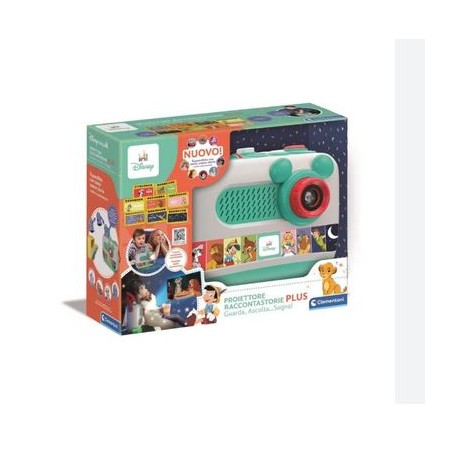 Un racconta storie innovativo con proiezione di immagini che accompagnano l ascolto coinvolgendo i più piccoli nel magico mondo dei classici Disney Sette famosissimi classici Disney riassunti in otto diapositive che i bambini potranno facilmente seguire e comprendere Per il momento della nanna è presente invece una tessera dedicata con melodie e ninne nanne Il proiettore raccontastorie include otto tessere contenute nel pratico vano sul retro una dedicata alla nanna e le altre con le più famose storie Disney Bambi Pinocchio Peter Pan Lilli e il Vagabondo Alice nel paese delle meraviglie la carica dei 101 e il Re Leone Utilizzo semplice con pochi tasti Tasto Play tasto Ripete Tasto Espelli Modalità di gioco Scelta Volume Luce notturna on off Il prodotto si presenta con un audio di ottima qualità due livelli di volume proiezione con messa a fuoco regolabile luce notturna e pratica maniglia Grazie a una doppia modalità di gioco il racconta storie è utilizzabile anche dai bambini più piccoli a partire da 12 mesi STATUINE VENDUTE SEPARATAMENTE
