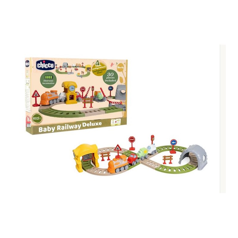 Scopri il Trenino Elettronico Chicco un mondo di avventure su rotaie per il tuo bambino Con 34 accessori e una locomotiva che si muove da sola stimola la fantasia e l abilità manuale Sostenibile e creativo è il gioco perfetto per piccoli esploratori Scopri il set da gioco dotato di 34 accessori Include locomotiva elettronica vagoni trasformabili e tanto altro per stimolare la fantasia I binari possono essere configurati in diversi modi scegli tra il percorso chiuso o il percorso aperto Realizzato con l 80 di plastica riciclata e senza vernici
