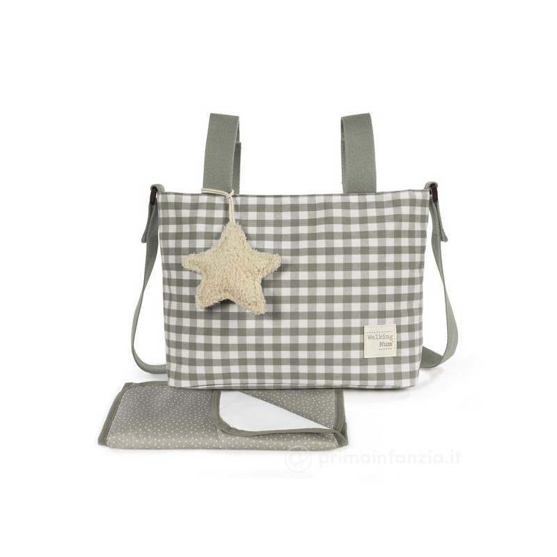 La borsa a tracolla per passeggino Caetana Stone con motivo a quadri verdi è un modello molto leggero resistente e capiente che ti permetterà di portare con te tutto il necessario durante la passeggiata del tuo bambino Include un ciondolo a forma di stella su cui potrai ricamare il nome del tuo bambino per personalizzare la borsa Oltre alla sua grande capienza è progettata per una facile organizzazione con diverse tasche interne che ti aiuteranno a tenere tutti gli accessori in ordine e a trovarli più facilmente quando ne hai bisogno Ha una tasca interna laminata per i vestiti bagnati una tasca interna termica e due tasche laterali Include un fasciatoio Il suo design moderno e casual la rende perfetta per l uso quotidiano e può essere abbinata a look casual o sportivi Include manici corti che ti permettono di agganciarla a qualsiasi modello di passeggino e un manico lungo per poterla portare a spalla Alta qualità e tanto stile Realizzata in 100 cotone con trattamento impermeabile facile da lavare a mano o in lavatrice a 30 C