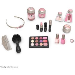Il prodotto ha un grande specchio inclinabile cassetti barattoli e portello portaoggetti per organizzare gli accessori 15 accessori fittizi inclusi 2 rossetti con funzioni meccaniche 2 vernici 1 mascara 1 palette per ombretti 3 barattoli 2 flaconi 1 pettine 1 pennello 1 anello e 1 serra testa