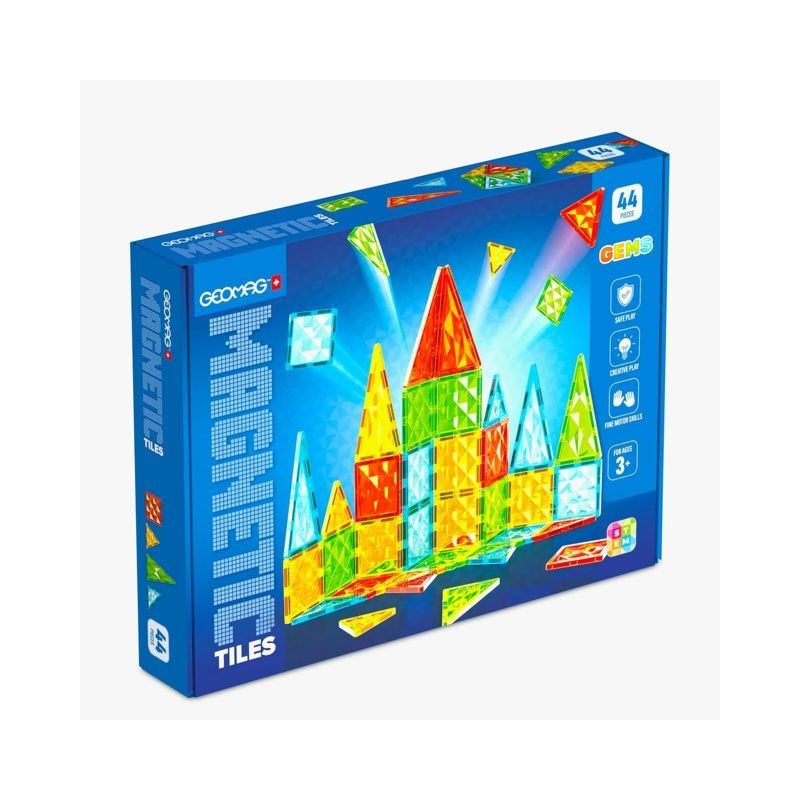 Il playset 4102 comprende 44 tessere magnetiche e combina un mix di 4 forme quadrato triangolo equilatero triangolo isoscele lungo e triangolo isoscele destro il set è composto da 4 colori Gemma trasparenti verde blu giallo e rosso