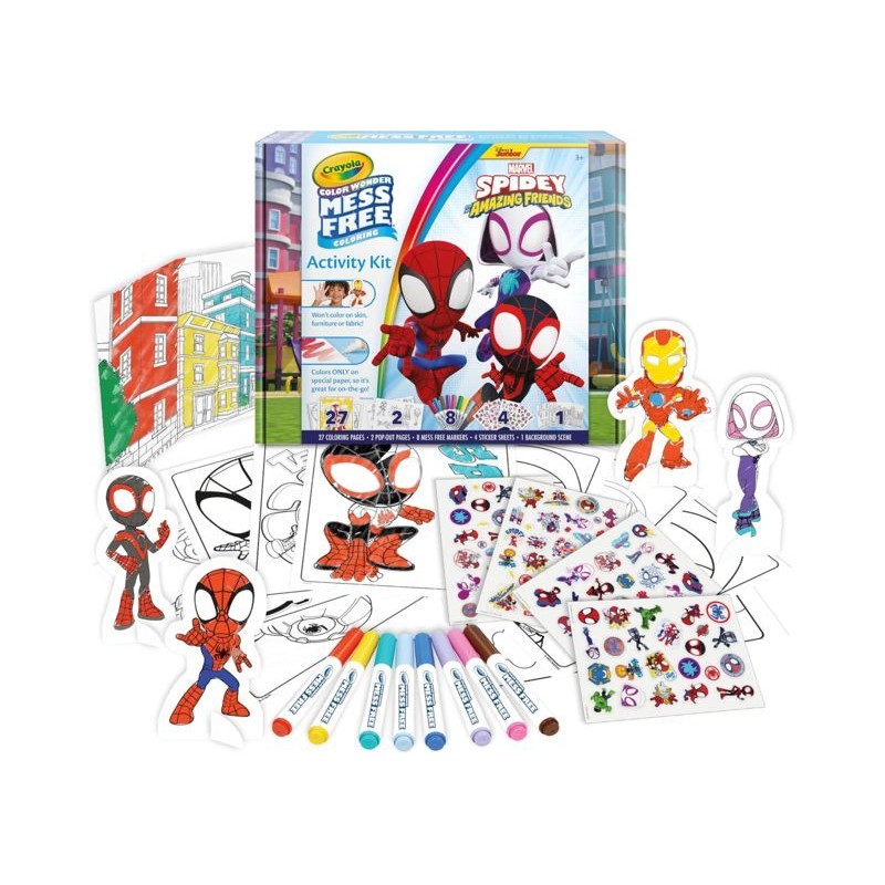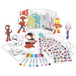 RICCO SET CON 40 PEZZI che comprende 27 pagine da colorare 8 pennarelli senza macchia 4 pagine di adesivi personaggi in cartoncino pop up da costruire e sfondo colorabile il tutto racchiuso in un favoloso astuccio tematizzato che tutti i fans di Spidey ameranno