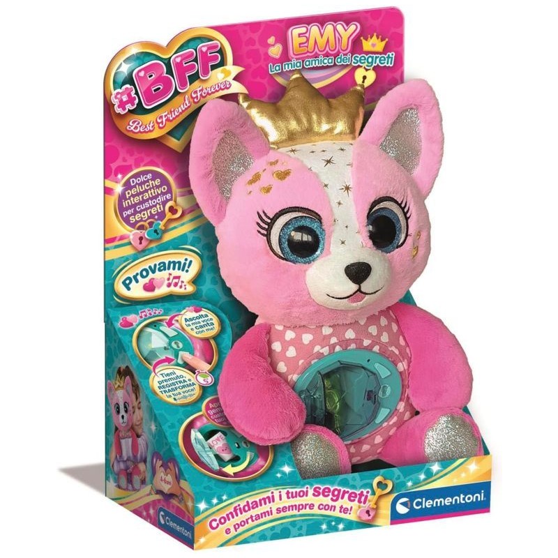 BFF EMY LA MIA AMICA DEI SEGRETI un peluche rosa interattivo e morbidissimo con cuore luminoso e modulo elettronico che permette di registrare e riascoltare messaggi nascondere piccoli tesori e vivere momenti di gioco ricchi di emozioni e fantasia