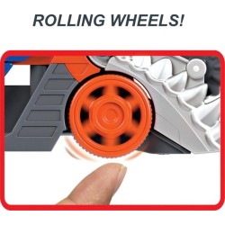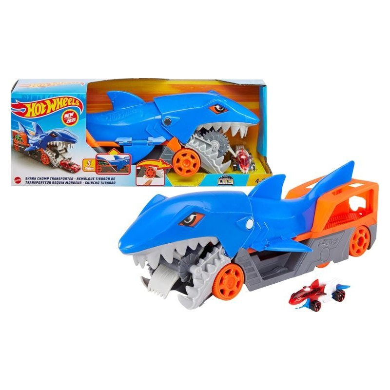 Il veicolo Hot Wheels Trasportatore Squalo Divoratore include un veicolo Shark Bite Hot Wheels e può contenere fino ad altri 5 veicoli macchinine aggiuntive in vendita separatamente