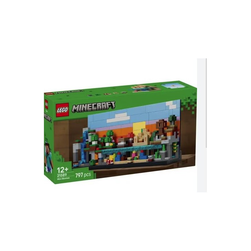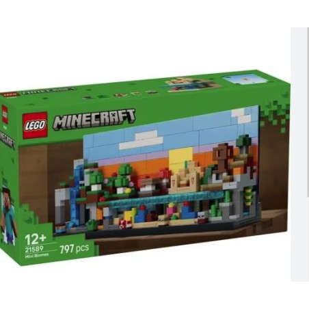 Il giocattolo LEGO Minecraft ha 5 biomi rimovibili montagna con grotta di gocciolamento geode di ametista e cascata foresta di fiori con grotta lava e oro campi di funghi con una barriera corallina naufragio 2 alberi di funghi rossi e un fungo marrone deserto con un tempio barriera corallina oceano cactus e scrigno e savana con un avamposto di pila gommata grotta Il set include anche uno sfondo reversabile giorno notte