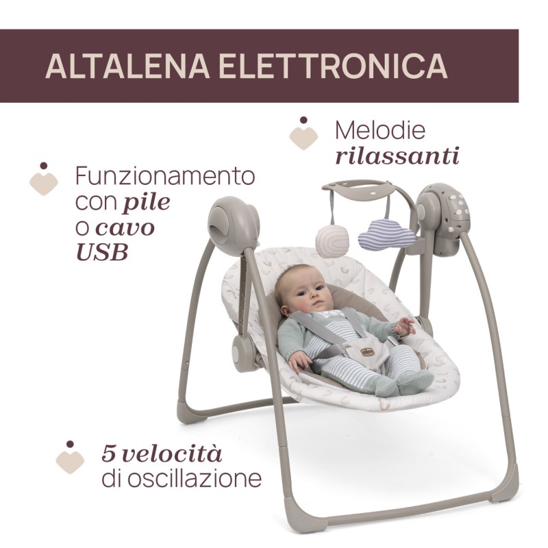 La soluzione ideale fin dalla nascita il mini riduttore assicura un comfort ottimale e la corretta postura per i neonati Dispone di una selezione di melodie pensate per calmare e intrattenere il tuo bambino mentre dondola Schienale regolabile in due posizioni per adattarsi alle esigenze del bambino Barra giochi rimovibile con due pendenti morbidi Chiusura compatta si richiude facilmente per essere riposta quando non in uso Alimentazione a batterie o tramite cavo USB Alimentato a batteria o USB