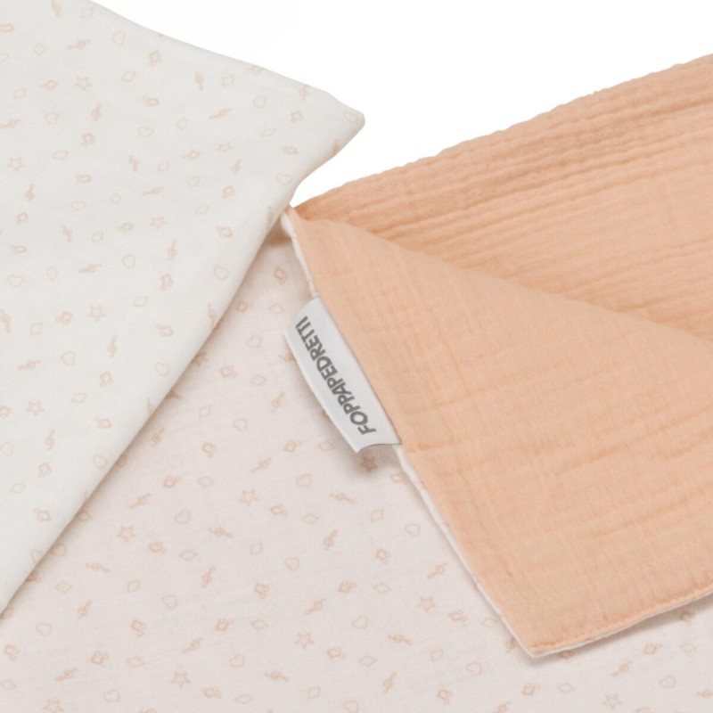 Il completo piumone double face per culla Evo di Foppapedretti Mammamia Collection è realizzato in mussola 100 cotone Oeko Tex ed è composto da fodera per piumino 100x100 cm e federa 35x25 cm