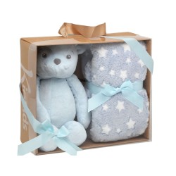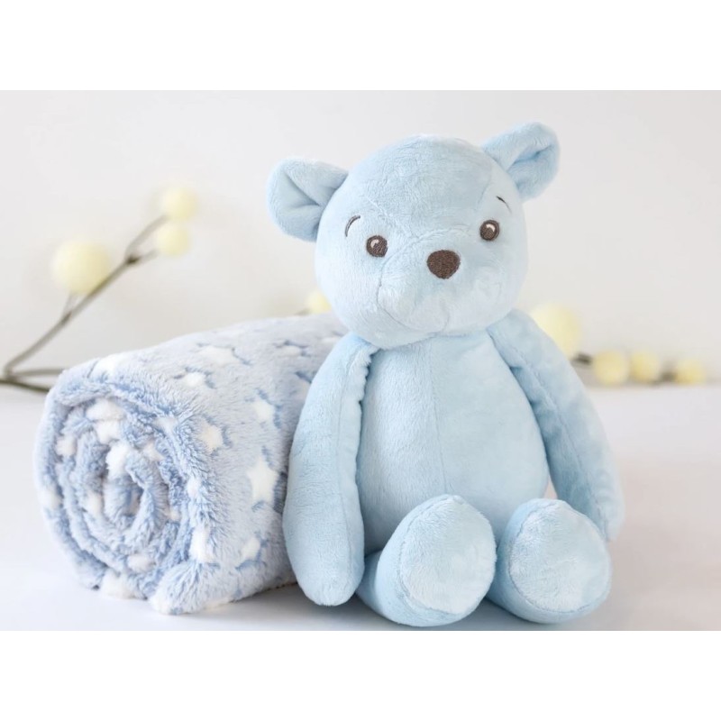 Questo morbido orso di peluche blu accompagnato da una coperta in pile con stampa di stelle è il compagno ideale per i primi mesi del bambino Perfetto da abbracciare e confortare sia a casa che ne