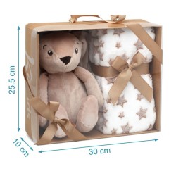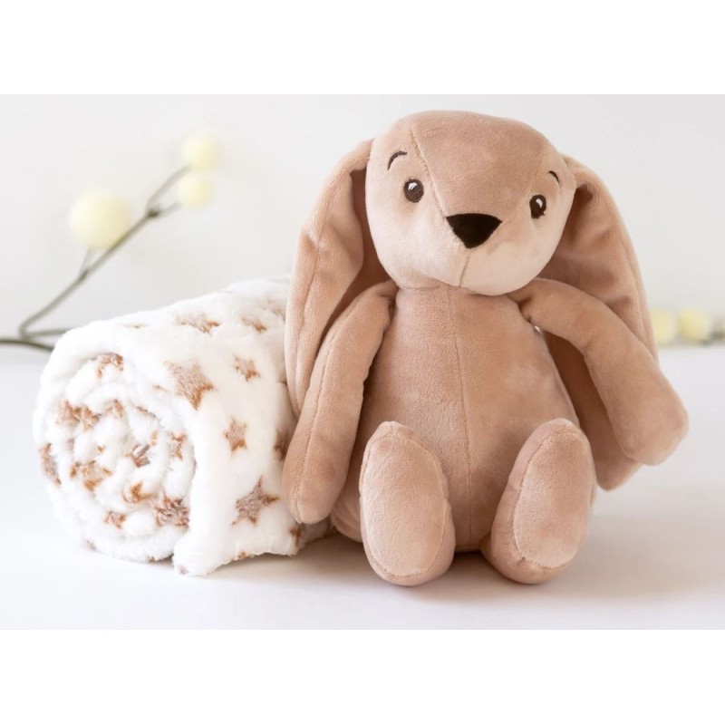 Questo morbido coniglio di peluche marrone accompagnato da una coperta in pile con stampa di stelle è il compagno ideale per i primi mesi del bambino Perfetto da abbracciare e confortare sia a cas