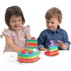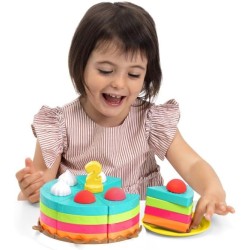 GIOCO DI IMILAZIONE E COMPOSIZIONE Il set permette di comporre la torta preferita scegliendo liberamente la combinazione di colori le decorazioni e gli strati Incoraggia il gioco di ruolo e il divertimento creativo con 24 fette e accessori
