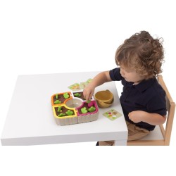 IMPARARE NUMERI E CATALOGARE COLORI Utilizza le 4 schede fronte retro per guidare il gioco il bambino raccoglie nel pratico cestino le verdure illustrate imparando così i primi numeri e affinando la capacità di catalogare i colori associazione visiva