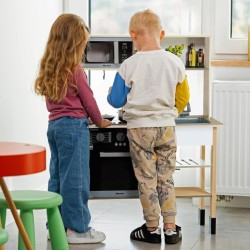La cucina giocattolo comprende fornello microonde un lavello estraibile così come delle pregiate stoviglie in metallo e legno