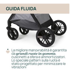 Manovrabilità garantita da ruote grandi e performanti cuscinetti a sfera e ammortizzatori I cuscinetti sono presenti anche nel sistema piroettante Passeggiate fluide e stabili grazie al design della ruota che riduce le vibrazioni al minimo