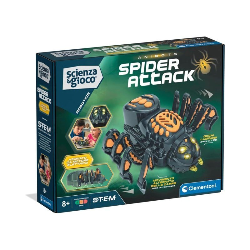 SPIDER ATTACK un robot da costruire che simula un vero ragno con un motore elettrico collegato a un asta dentata che aziona in maniera alternata le otto zampe in modo realistico un kit stimolante per scoprire la robotica in modo attivo e divertente